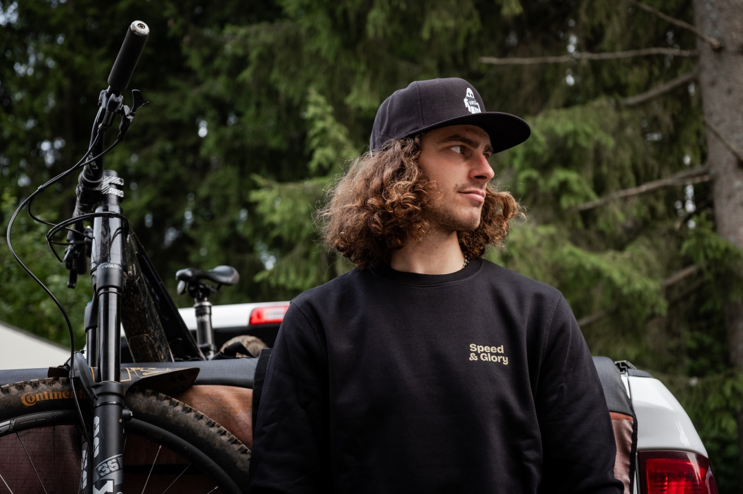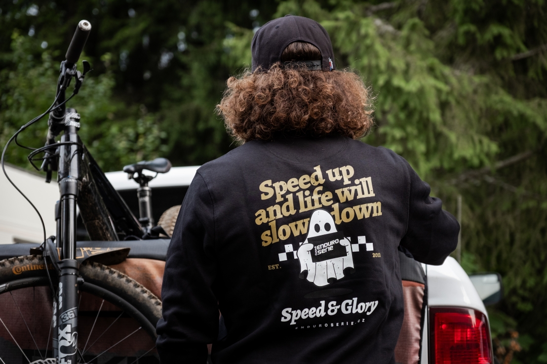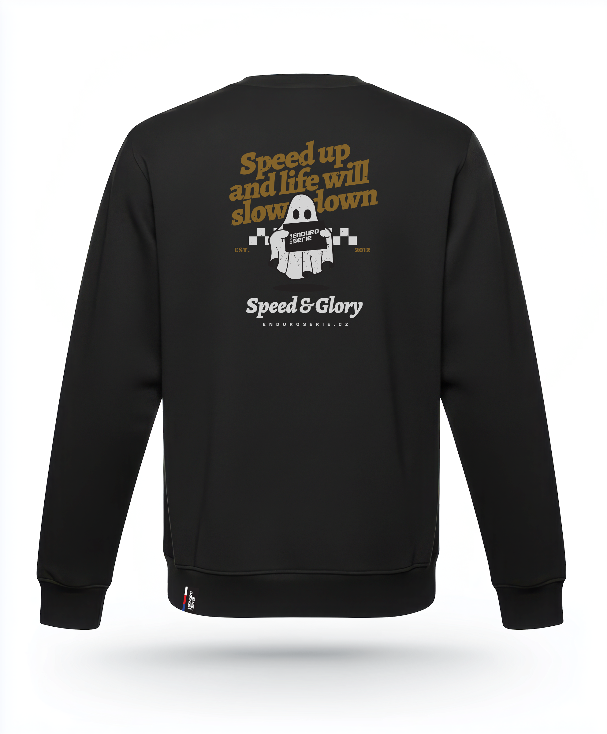Pohodlná černá mikina s textem Speed & Glory na přední straně a vzadu s obrázkem ducha České Enduro Série