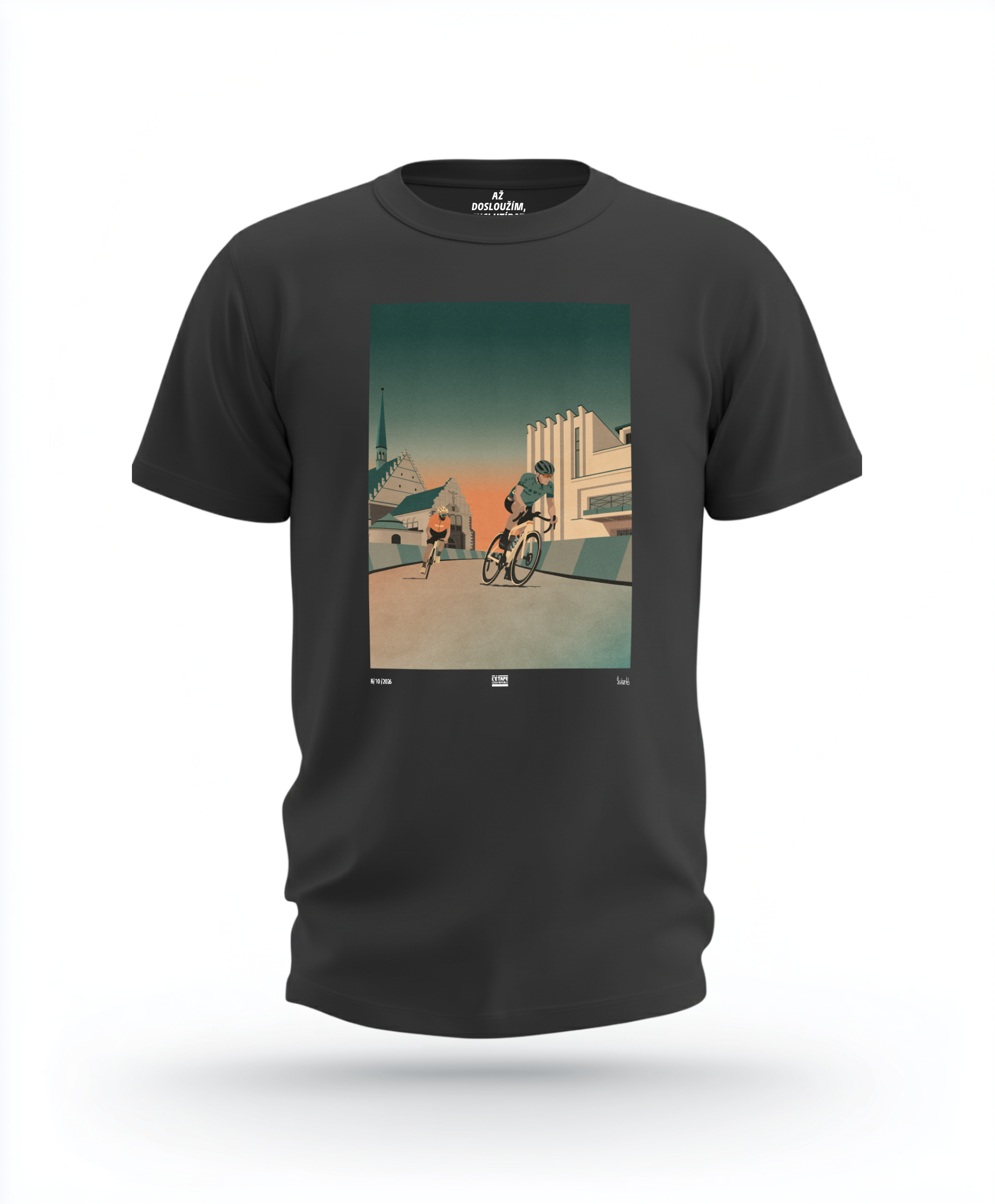 Kvalitní černé triko s exkluzivní grafikou od vizuálního umělce grafika a ilustrátora Jana Šrámka, na které nechybí cyklisté, Dům hudby a kostel svatého Bartoloměje v Pardubicích.