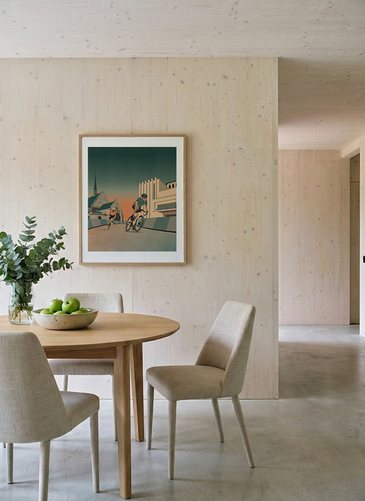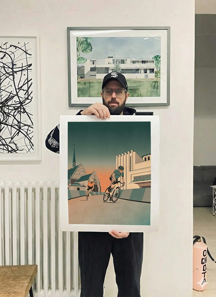 Originální plakát s exkluzivní grafikou od vizuálního umělce grafika a ilustrátora Jana Šrámka, na které nechybí cyklisté, Dům hudby a kostel svatého Bartoloměje v Pardubicích.